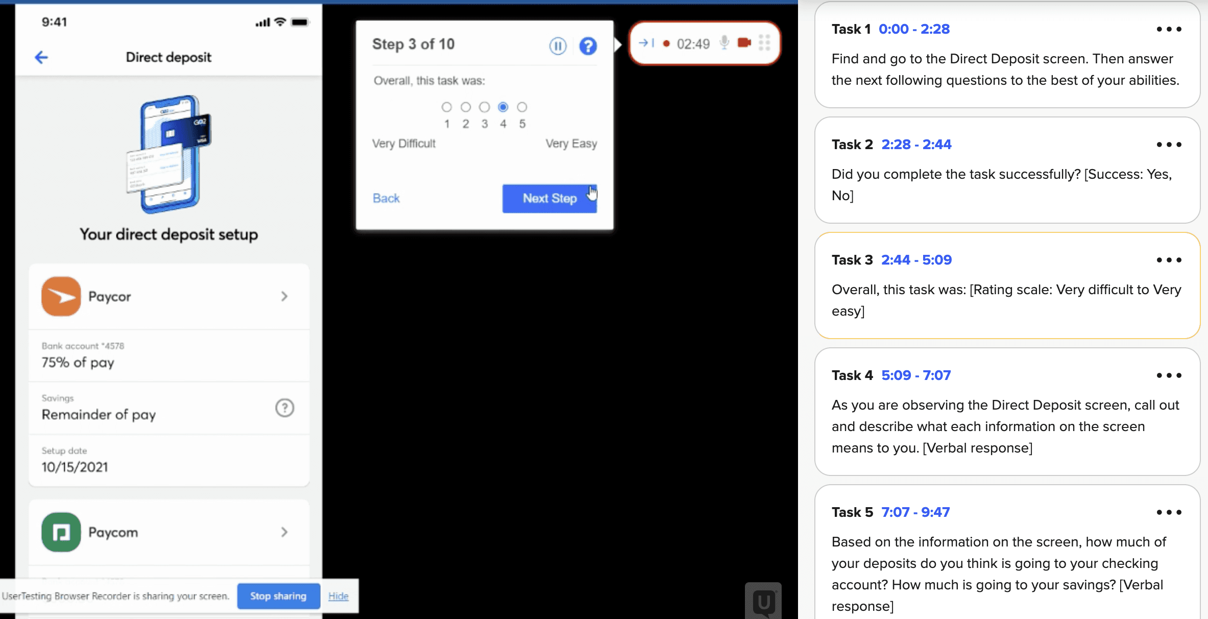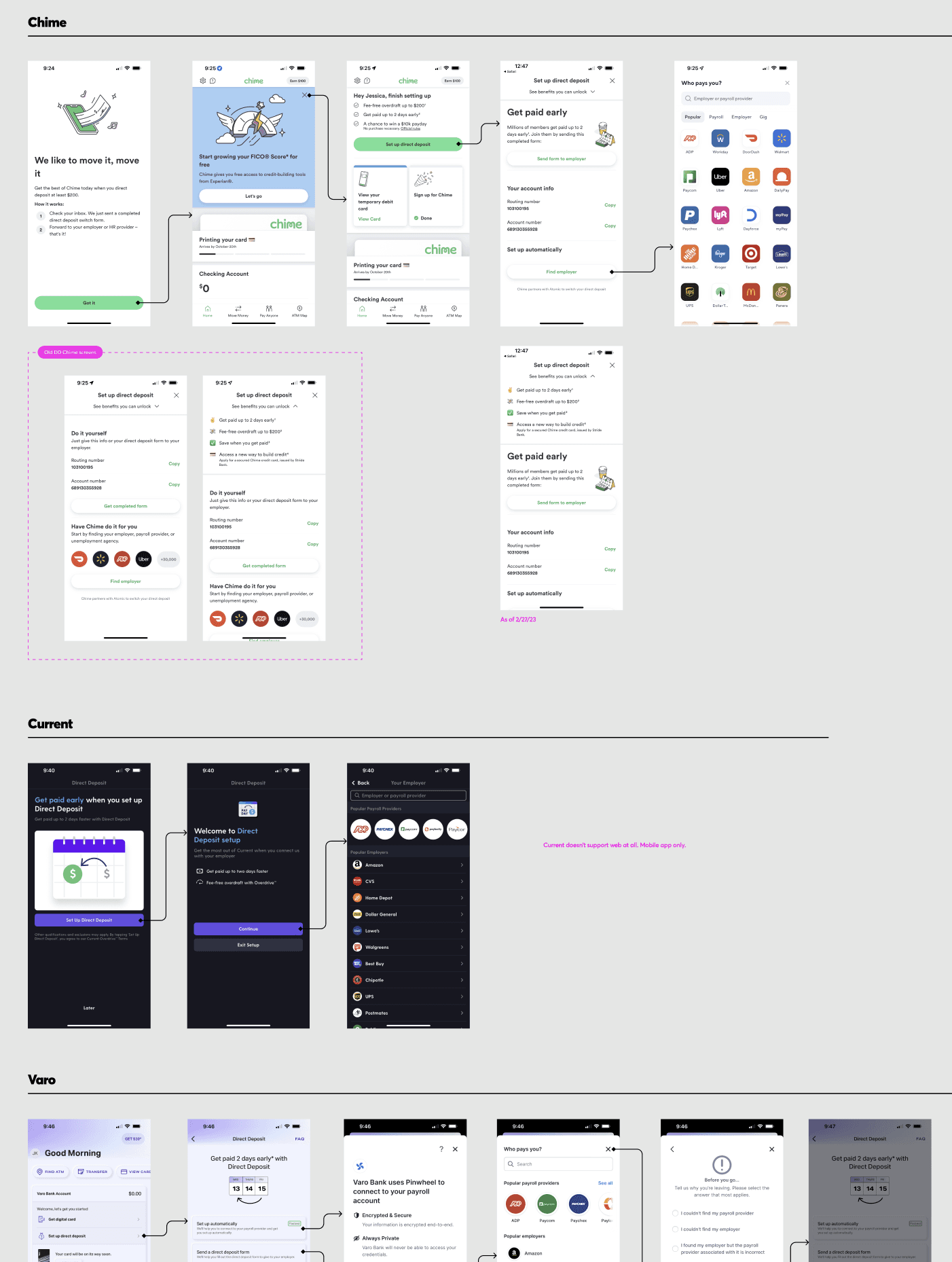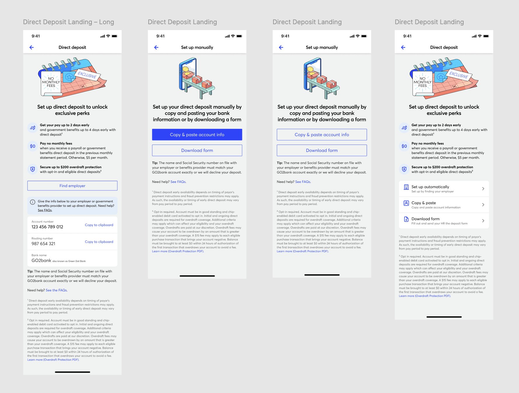 After collaborating with the product team to review requirements, I conducted research to validate if they met user needs. I assessed what worked, identified areas for improvement, and benchmarked our approach against competitors. During this discovery, we found key elements on the existing DD landing screen that were effective, leading us to forego certain changes, such as copying account and routing numbers. We also noted competitor strategies, like using separate panels to distinguish between finding an employer and manually entering information in a direct deposit form.